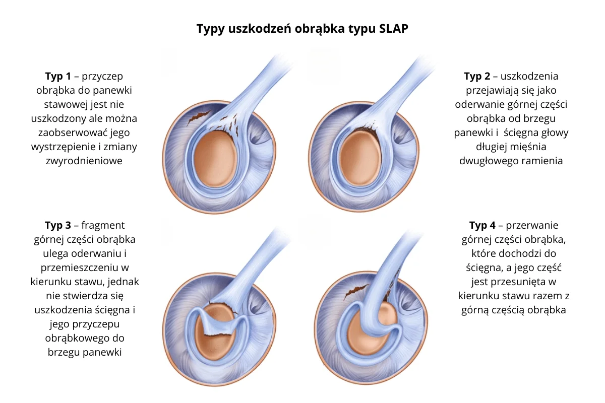 Wyróżnia się kilka podtypów SLAP (I–IV), które różnią się m.in. rozległością uszkodzenia obrąbka oraz zaangażowaniem ścięgna bicepsa. W zaawansowanych przypadkach może dojść do oderwania ścięgna bicepsa wraz z obrąbkiem od panewki.